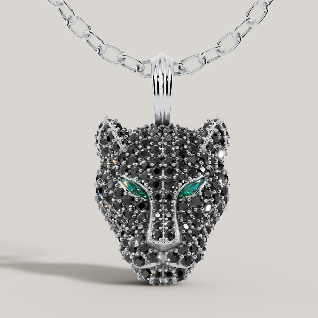 Premium silver Black Panther necklace embellished with black onyx stones & green marquise eyes. Bold, luxurious, and crafted to perfection — a true symbol of strength and elegance.